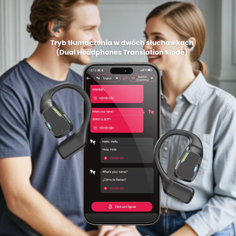 - Tryb dwóch słuchawek: Dwie osoby używają po jednej słuchawce do dwukierunkowego tłumaczenia